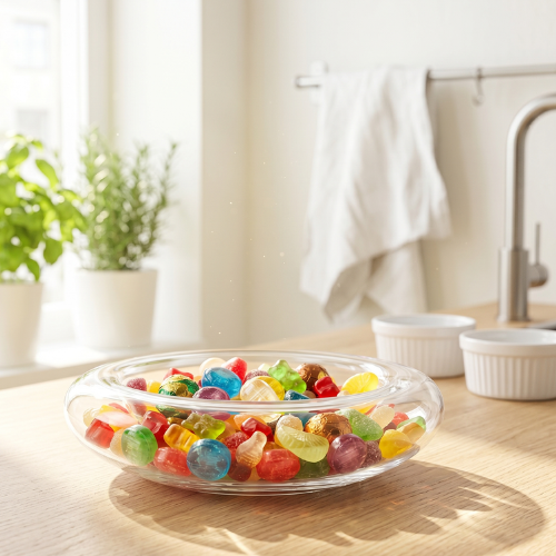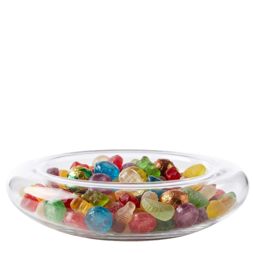 La Bonbonnière Bowl Warp,met en valeur vos confiseries, fruits secs ou éléments décoratifs avec élégance et transparence, et est disponible en plusieurs dimensions (Ø17,5 x H6,5 cm ; Ø24 x H8 cm ; Ø32 x H9,5 cm).