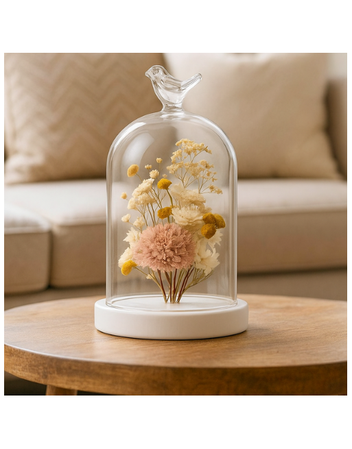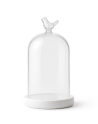 Glass dome on white base with bird Ø12,5 H.19 cm